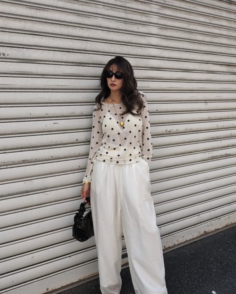Here’s the thing yeah, sheer tops are already doing the most (in the best way). So when it comes to styling, less is more. Keep your makeup soft and fresh, and go for simple accessories. Think dainty jewelry, clean silhouettes, and maybe a sleek bag. We think this keeps the whole look balanced and lets your outfit speak for itself… without yelling for attention.