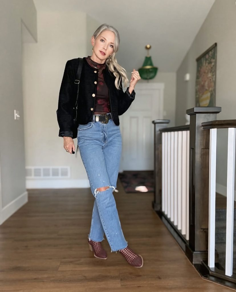 Yep, sheer tops aren’t just for summer, you can also make them work when the weather is chilly too. Just layer a chunky knit sweater over your sheer top for a perfect mix of edgy and cozy. It’s an effortlessly laid-back look that still lets a little sheer detail peek through underneath. Warm? Check. Stylish? Double check. Honestly, we can say it’s the ultimate cold-weather fashion hack.