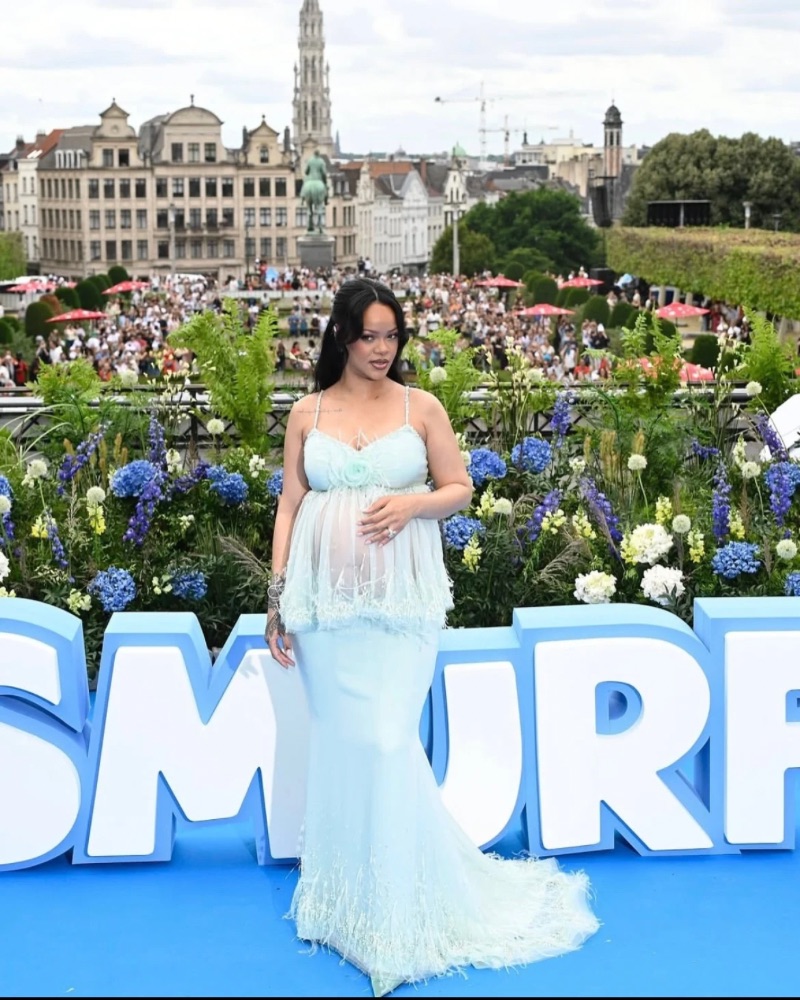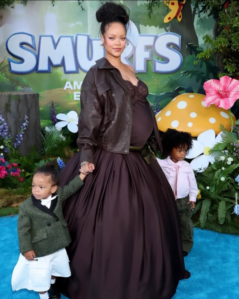 Leave it to Rihanna to turn the Smurfs movie premiere into a full-on fashion moment. She showed up in a chocolate brown Saint Laurent dress with lace detailing, an olive-green sash, and a brown leather jacket for some warmth—total slay(you didn’t think boring, huh). Her baby boys weren’t left out either, rocking custom Dior looks. Later that night, she switched it up for dinner in a bold, belly-baring Alaïa outfit: a cropped white knit hoodie and a towel-inspired low-rise skirt wrapped around her bump like a runway piece.