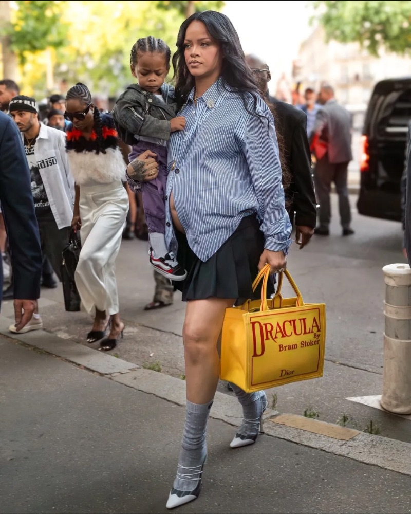 Rihanna took the front row at the Dior menswear show during the 2025 Fashion Week in Paris. She wore a preppy-meets-edgy look, carrying a cute yellow tote designed by Jonathan Anderson. Rihanna layered a mint green vest over a crisp button-down shirt, finishing the look with a dark cape and grey trousers. A strand of pearls and dark shades sealed the deal. This outfit was maternity style, yet editorial.